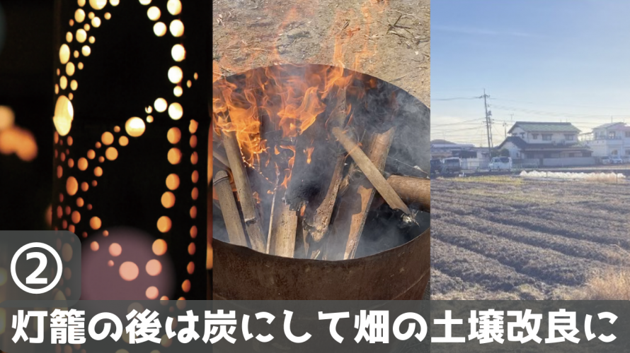 使い終わった竹灯籠は燃やして竹炭にし、土壌改良材として農地に返します。